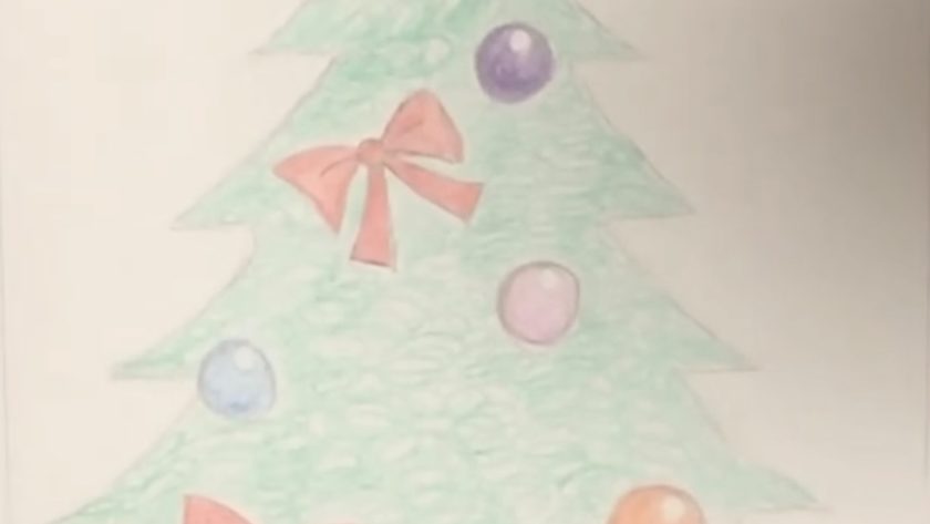 クリスマスツリーを描く時のコツを説明しながら、